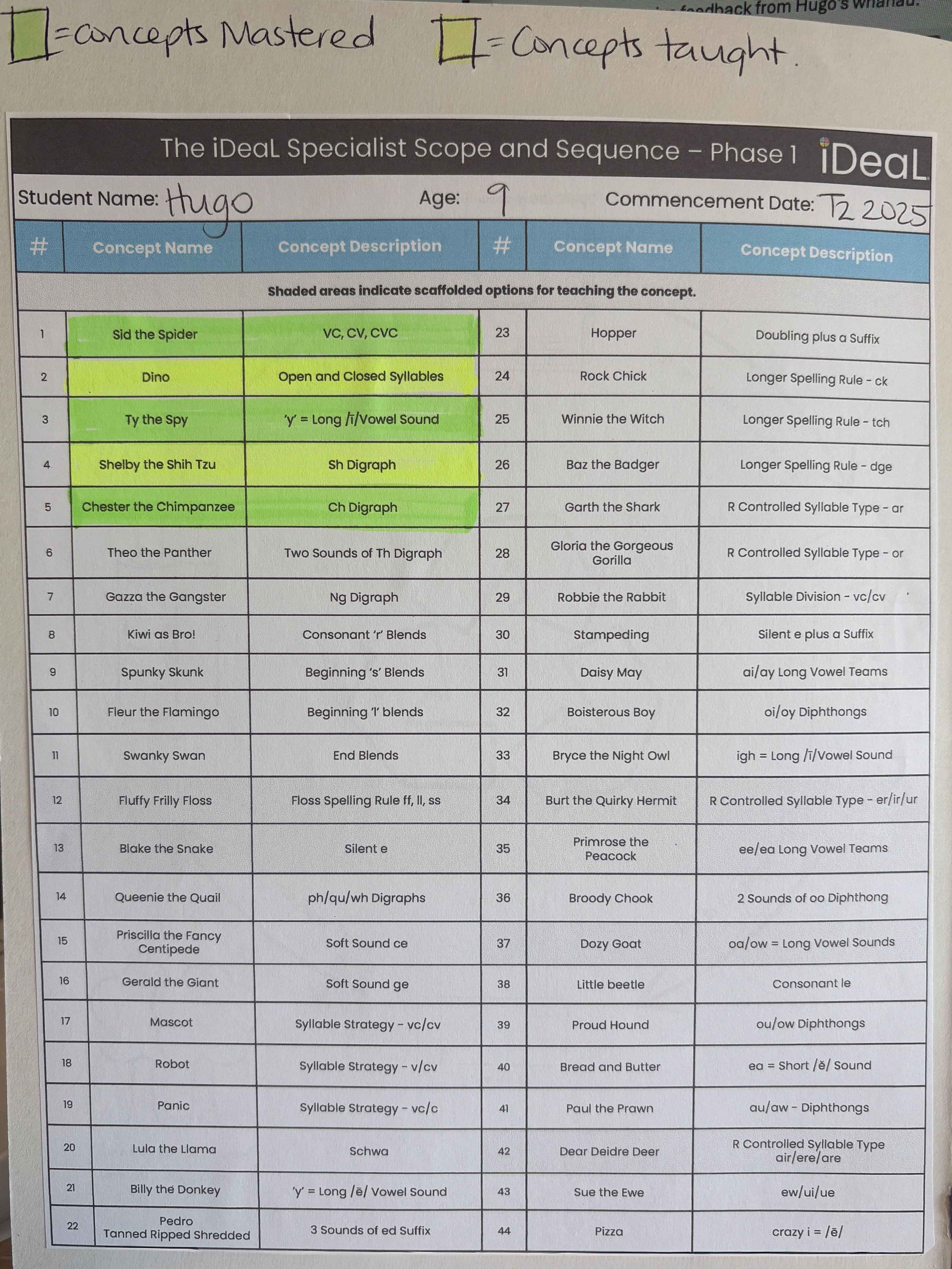 Ange, one of our team members, completed the Mini Literacy Assessment with Hugo and began working with him using the iDeaL Approach for Specialists. This has given us a valuable opportunity to explore how these specialist resources, originally developed for 50–60 minute lessons in a private tutoring setting, can be adapted for use in schools, where sessions may be shorter and shaped by timetable constraints. In Hugo’s case, all sessions with Ange are 30 minutes long and occur twice per week – providing a consistent structure as we observe and reflect on his learning journey.