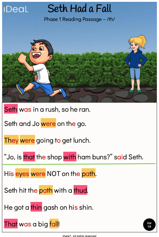 For this session, ‘Seth Had a Fall’ was selected as the decodable text. Although it included more irregular words than the other text for this concept, ‘Maths Was Fun’, it was the better fit for breaking the learning across two sessions. With explicit teaching of the irregular words, Hugo would be set up for success, even if extra review was needed due to the number of new words introduced.