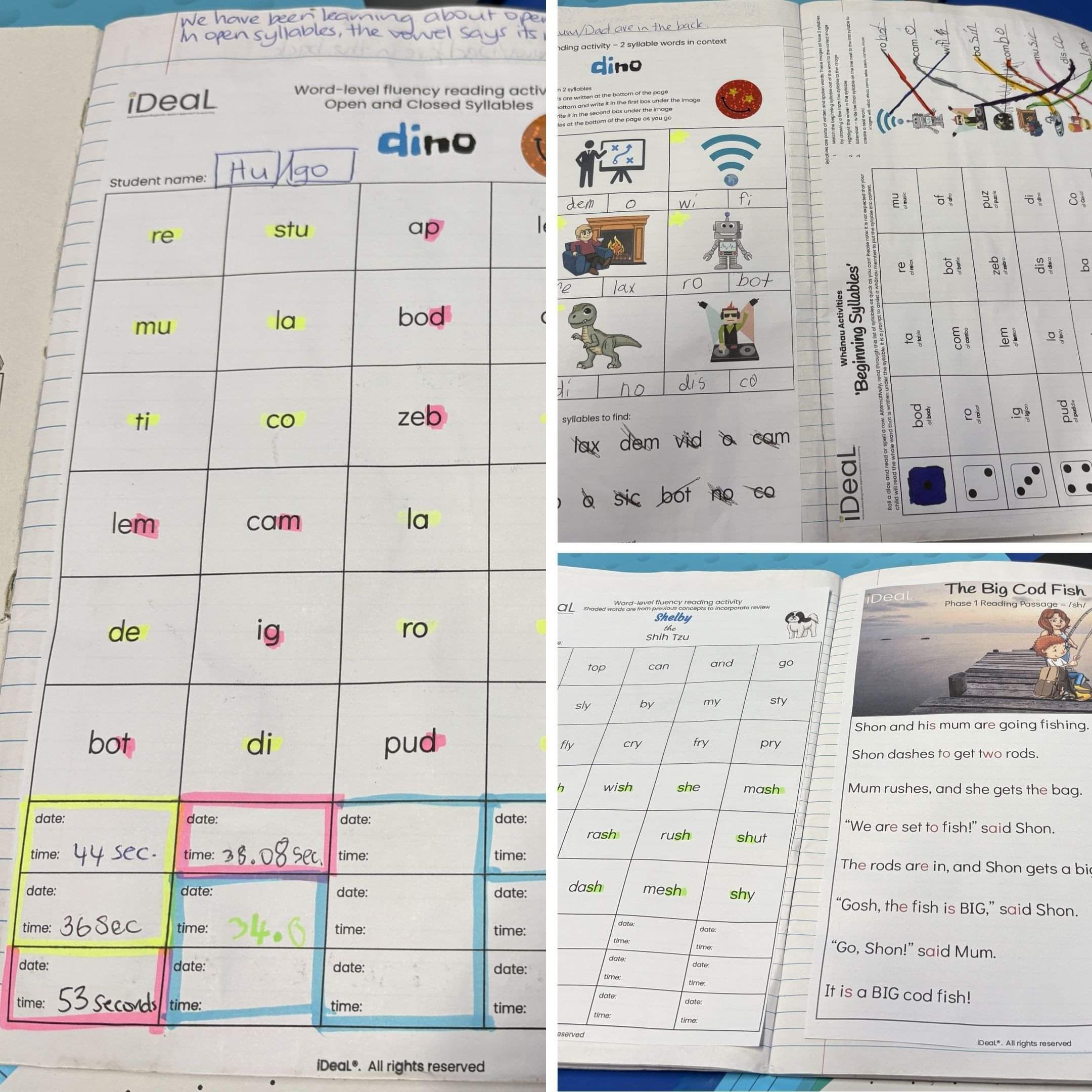 Hugo has shown growing motivation to "beat his time" on the word-level fluency reading tasks. Before beginning each set, we draw attention to the focus concept, for example, all words containing the /sh/ sound. Words featuring previously taught concepts are left blank or shown in a different colour to reinforce prior learning. This repeated, purposeful practice is strengthening his word-level automaticity.