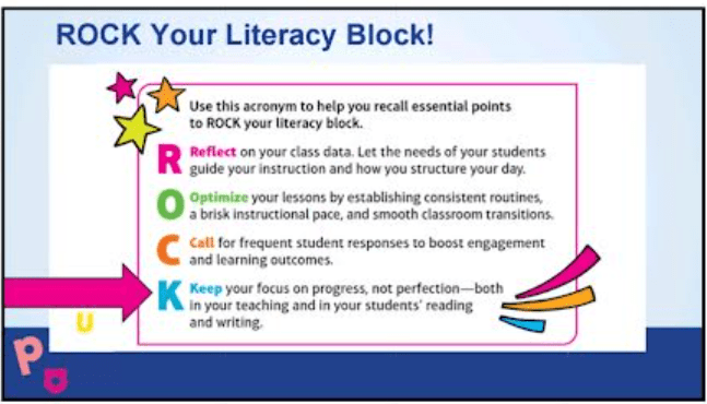 Time is precious, so Lindsay introduced the ROCK acronym to help teachers make the most of their literacy block: